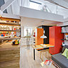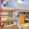 « Côté couleurs, tout est parti de pièces de céramique réalisées par une artiste et insérées dans le carrelage de la cuisine et de la salle de bains. Les teintes de leurs décors et motifs ont été le point de départ de la gamme chromatique développée dans ces deux pièces », raconte l’architecte Antonio Torres. Et côté espace, il a pris le parti de créer une grande pièce à vivre avec une cuisine centrale et véritable pivot, avec un coin repas et un espace détente. A la place de l’encombrant escalier existant pour accéder à la chambre, des marches ont été intégrées à l’extrémité du rangement bas de la cuisine. Cette nouvelle zone de communication sans contremarches a été ainsi conçue la plus transparente possible.