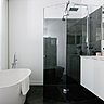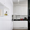 La salle de bains était située derrière la cuisine, à l’opposé de la chambre, seulement munie d’un placard. La cuisine formait une alcôve semi-ouverte, dont la présence visuelle, trop forte, encombrait l’espace. « Les propriétaires désiraient retrouver le volume d’une pièce de réception avec un vrai coin canapé, et un espace salle à manger. Il fallait aussi créer des rangements dans le séjour. Pour faciliter la circulation, nous avons créé une ouverture, côté chambre, pour suppléer à celle déjà présente dans la salle de bains, avant sa création. En continuité des placards de la cuisine, nous avons dessiné une bibliothèque et un dressing proche de la porte de la salle de bains, pour compenser avantageusement la perte du placard de la chambre initiale. Et la tête de lit sert aussi de rangement», raconte Agathe Lesage.