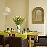 Bois et cuir donnent le ton côté salle à manger. Bois pour cette grande table de salle à manger et ces deux miroirs façon « ancien » entourés de fauteuils cuir pour une ambiance cosy. Le salon donne la part belle à des noms de designers célèbres : Mies Van Rode pour le fauteuil et Isamu Noguchi pour la table basse. L’ensemble est associé à un canapé et un tapis blanc pour créer un effet d’unité. Des touches de couleur à travers les coussins, les tableaux, les objets d’art viennent égayer l’ensemble. La couleur verte est omniprésente dans la décoration éphémère, fleurs, linge de table, pour une douceur toute en légèreté.