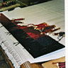 1. la création : « mettre en carte le motif » signifie transcrire le dessin, les coloris et les contours, initialement réalisés par l’artiste, pour le tissage. Sans ce travail préalable, le tissage n’est pas envisageable.