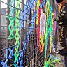 Là où les graffeurs ont besoin d’un mur pour « poser leur blaze » c’est un simple grillage qui leur sert de support tout en laissant apercevoir le paysage urbain par transparence. Loin des vapeurs des bombes de peinture, c’est le froissement du tulle et le crissement des ciseaux qui rythment les réalisations des Deuz’ Bro. Leurs outils : Boite à couture, rubans de tulle fluos »