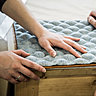 La matière a été appréhendée comme alternative et matière à réflexion pour un développement durable. Les étudiants ont eux-mêmes réalisé le prototypage et l’expérimentation. La toile de lin pour les bagages a été thermocompressée avec du polypropylène. Et même les étudiants de l’IFM Marketing ont mis la main à la pâte… Ces projets ont été menés conjointement par deux jeunes artisans cordonnier-bottier, maroquinier, sellier et tapissier des Compagnons du Devoir et du Tour de France, deux élèves en création industrielle et en design textile de l’ENSCI et deux étudiants en management de la création de l’Institut Français de la Mode. Les dalles de sol pour l ‘intérieur a été élu Prix d’ Excellence du DEFI 2016. Expérience tactile nouvelle pour le lin et confort acoustique renforcé !
