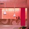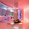 Le visiteur est guidé par un somptueux banc en Zodiaq® (4 mètres de long), de forme organique, qui comme une draperie, s’étire puis entoure une colonne-miroir. Un comptoir, dans le même matériau lui fait écho. Au-dessus du banc, des enceintes suspendues en Corian® créées par Karim Rashid.