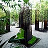 Le tout est dans l'art de l'eau. On ne peut jamais prévoir à cent pour cent où elle va couler, où vont se fixer les couleurs, ni où les gouttes d'eau vont éclater comme des petits météores sur la pâte à papier, affirment les créateurs. À l'occasion du 19 ème Festival International des jardins de Chaumont-sur-Loire*, dont le thème 2010 était : Jardins "corps et âme", on a pu découvrir l'étonnant "Jardin en Papier" de Jean-Michel Letellier et Miki Nakamura. Si le Japon est le pays du papier, celui-ci permet de correspondre avec les Dieux selon une coutume ancestrale appelée Kamitsubute, qui consiste à prendre un petit bout de papier dans la bouche, à le mâcher, puis à le recracher sur une statue de pierre dans le jardin d'un temple. Plus la boulette de papier reste collée haut, et plus l'avenir sera heureux et prospère ! En japonais Kami signifie papier et Dieu à la fois. Partant de cette relation entre le corps et l'esprit, notre couple d'artistes, ensemble avec deux architectes, ont imaginé un jardin dont les allées forment l'idéogramme de l'âme, le Tamashi. Le jardin offre la découverte des œuvres en papier réalisées avec l'écorce de mûrier. Seuls les végétaux utilisés pour la fabrication du papier ont été sélectionnés (bambous, chanvre, graminées, peuplier, papyrus). L'absence de fleurs concourt à accentuer l'effet vibratoire provoqué par les feuilles et leurs nuances.