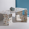 Il séduit par son graphisme coloré, son aspect minéral… Dans les années 80 le mouvement Memphis s’en est emparé, en clin d’œil, de façon décalée, en mixant les matériaux hétéroclites. Aujourd’hui, il est recoloré et simplifié pour l’adapter à l’air du temps. Il habille le mobilier, les accessoires jusqu’à la papeterie ! Même si les interprétations proposées sont parfois un peu éloignées du beau matériau d’origine, la création n’a pas de limites!!
