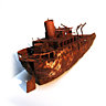 Travail entre terre et mer, les cargos symbolisant une histoire maritime et leur statut d’épave les ramenant petit à petit vers la terre, là où toute chose retourne !Un défi anecdotique est le point de départ de la série d’épaves, toute une poésie post-industrielle mettant en scène des reconstitutions d’épaves de cargos, le travail est minutieux, réalisé dans des vieilles plaques de tôles ou autres objets métalliques de récupération (carlingue de machine à laver, vieille chaudière...).