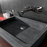 En pierre sombre, cette vasque peut être fabriquée sur commande dans la forme et les dimensions que vous souhaitez. Ici H 10 x L 60 x p 40 cm. 690 €. Mélangeur mural à trois trous en laiton chromé, garanti 8 ans. Aux murs des carreaux en grès céram couleur basalte 30 x70 ou 40 x 40 cm. Le tout chez Aquamondo. www.aquamondo.fr