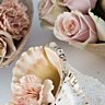 Les premières roses de saison sont associées à des œillets et des astrantias. Les couleurs douces et pastel sont rehaussées par la nacre des coquillages rapportés d’un voyage dans les îles.