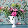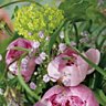 Partez d’un papier peint fleuri ou un tissu à l’esprit romantique et copiez le même bouquet dans sa composition et ses tonalités. Effet 3D garanti et fraîcheur redoublée. Ici, les pivoines sont associées à de la gypsophile rose et du viburnum (boules de neige).