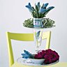 Composez une sorte de petite pièce montée ou un serviteur utilisé pour la présentation des gâteaux. Le principe est de jouer avec de la vaisselle et des verres pour accueillir des grappes de fleurs comme ici une composition d’œillets, de muscaris et de fleurs de carotte.