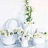 Un camaïeu de fleurs blanches disposées dans une foultitude de contenants divers bombés de peinture blanche. Chic, élégant et intemporel comme cette composition de gerbera avec des renoncules, des pois de senteur et du delphinium.