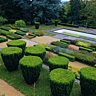 Une allée rectangulaire, à peine tronquée à son sommet, enserre un parterre de pelouse résolument plane, auquel huit topiaires distribuées sur ses flancs assurent le relief indispensable. Deux plates-bandes, de part et d’autre, hébergent leurs jumelles végétales sculptées, l’horizon étant borné en ces lieux par un dernier rectangle d’herbe rase, au-delà de l’allée, au-delà des volutes gravées à même le gazon sur les franges du parterre. Il est, au pied de ce château, une clairière, un trou de verdure où la main du jardinier règne en maître. Jardin du château de Busset, gardez vous à droite, gardez vous à gauche de la nature qui vous entoure, des arbres isolés, des massifs non taillés, des haies sauvages du bocage, de tout ce qui pourrait nuire à votre ordonnancement si bien agencé !