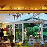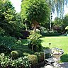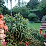 Nous nous trouvons maintenant au centre du jardin, tout autour des massifs harmonieux avec des taches de couleurs dues aux hêtres du japon rouges. Dans le fond deux boulots donnent de la perspective, un sapin protège une maisonnette à laquelle on accède par un petit chemin ou siège une statue d’un mouton avec une poule sur le dos. Dans les massifs sont disposés des clins d’œil un peu partout : des maisons à oiseaux, des statues, le tout sous la surveillance d’un petit joueur de flûte, qui n’attend plus que vous pour entamer un morceau de musique bucolique.