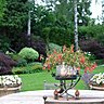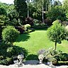 Une terrasse recouverte de petits pavés reproduisant le plan de la maison et de son jardin. Deux vasques blanches garnies de pétunias blancs et deux acacias taillés en boule ouvrent la voie sur la pelouse centrale, parfaitement tondue par un robot tous les 15 jours. Dans les massifs de devant on trouve des lavandes, des rosiers, des rhododendrons, des boules de buis, le tout se complète pour ne forme qu’un tout verdoyant.
