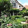 Nous avons visité un jardin de la banlieue bruxelloise. La maison bourgeoise est gardée par un jardin à l’anglaise entourée d’une haie de thuyas et des treillis avec des passiflores qui y grimpent, au-dessus de la porte d’entrée des glycines parmes, glissent le long du mur comme pour en protéger son accès. Un petit jardin ou se mixte des haies de buis, des rhododendrons, des rosiers blancs et roses,
