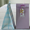 Replier le haut du sachet, percer 2 trous avec la perforatrice pour le passage du ruban, et décorer d’un demi napperon en papier.