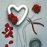 Glisser et nouer un fil de fer assez long dans le creux du cœur, piquer le bout de la branche dans le polystyrène au travers des pétales, torsader les 2 brins de fil de fer bien serré autour de la branche.