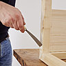 Afin d‘éviter que le bébé ne roule sur le côté et pour assurer une bonne stabilité de la maison, il convient d‘ajouter trois planches en bois (« D »). Pour ce faire, découpez la planche en bois avec la scie multifonctions sans fil de sorte à insérer une planche sur les deux côtés (62,4 cm de longueur) et une planche à l‘arrière de la maison (70 cm de longueur), dans le cadre. Insérez les planches découpées et fixez chacune d‘elles au cadre en vissant deux vis depuis l‘extérieur du cadre. Là encore, il faut pré-percer tous les trous latéralement depuis l‘extérieur avec la mèche en bois avec aléseur, conformément aux repères indiqués sur le plan de construction.