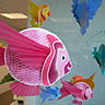 Pour donner un effet 3D aux poissons, ils sont assemblés par collage en coque, les nageoires des poissons sont découpées et pliées en suivant les plans précis présentés en step by step. Une fois les papiers calques colorés, découpés et pliés, l'enfant les glissera dans le corps de chaque poisson pour leur donner ce côté aérien. Reste la partie de l'équilibrage qui consiste à monter son mobile à l'aide de fils transparents et à les positionner au mieux pour que toutes les tiges soient bien parallèles.