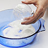 Matériel : Pistolet à colle Dremel ®930, bâtons de colle blanche et pailletées de 7 mm, Dremel ®3000, Flexible Dremel ®3000, Pointe diamant 7105, lunettes de protection, boules de Noël en verre de 8 cm de ∅, poudre blanche et pailletée, papier absorbant, assiette creuse, cuillère.