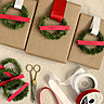 4.Découpez 15 cm de ruban blanc ou rouge, pliez-le en deux en introduisant la couronne et fixez -la au dos du paquet avec des adhésifs double face.