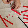 2. Découpez les extrémités des bandeaux de papier en V avec les ciseaux. Ecrivez le nom des invités avec le stylo, on trouve des stylos à l’encre or ou argent qui leur donneront un air de fête.