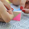 1. Commencez par poser l’adhésif crêpe sur vos cubes pour créer des lignes nettes. Prenez une petite longueur de ruban et appliquer un coin sur une face du cube. Ensuite, posez une bande sur les côtés opposés de sorte à obtenir un triangle 45-45-90 ° de bois à peindre. Répétez l'opération sur chaque cube.