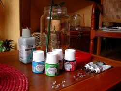 Loin des décorations vites faites, cette réalisation ouvre sur toutes les techniques possibles pour faire du verre un support à votre créativité. De la peinture vitrail classique particulièrement destinée au verre, certes, mais associée à de la peinture satinée pour tous supports ainsi qu'à des strass...