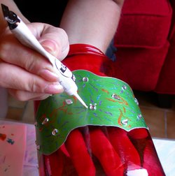 Avec le pinceau fin, tracez autour des strass des volutes de couleurs variées orange, turquoise, violet, comme si vous dessiniez les pétales de fleurs imaginaires ou des étoiles filantes.