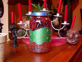 ...Volontairement baroque, largement inspirée du graphisme oriental, ce pot en verre, on ne peut plus banal prend une valeur décorative toute personnelle.