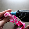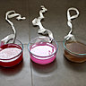- Préparez les teintes : laissez tremper le sachet de Coloria Gris dans un pot et le sachet de Coloria Fuchsia dans un autre pot pendant 3 mn, puis le sachet de Coloria Fuchsia dans le troisième pot pendant moins d’une minute.