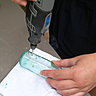 Fixer la fraise correspondant au trou à perforer dans l’outil Dremel 300, 4000 ou 8200, appliquer une goutte d’huile sur la surface du verre, placer l’outil de façon à ce que la fraise soit à 45° de la surface pour faire une première accroche de perçage.
