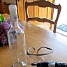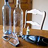 Choisir une jolie bouteille, la faire tremper dans de l’eau chaude pour ôter les étiquettes, enlever les résidus de colle avec du dissolvant et s’installer confortablement pour le perçage : caler la bouteille dans un coussin et repérer la zone de perçage par un point de feutre.