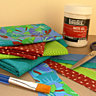 Une fois les 5 tissus réunis, choisir de bons ciseaux pour couper précisément les tissus, 1 brosse plate à poils synthétiques et du gel médium acrylique mat habituellement utilisé pour les Beaux Arts et qui colle naturellement, sans effet de brillance ni de rigidité.