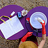 Il vous faudra : une grande bassine en plastique, une spatule, des ciseaux, des gants ménagers, des sacs en en coton blanc ou écru de 100 % coton, 500 gr de gros sel ou sel fixateur Idéal, 1 biberon de colle vinylique, boite teinture textile Idéal liquide.
