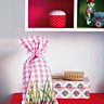Un petit sac en tissu vichy rose et blanc délicatement brodé d’herbes folles au point lancé empiétant et d’insectes au point lancé.