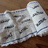 De ces nombreuses passions il y a celui des mots avec lesquels elle aime jouer, et qu’elle a couchés non pas sur papier mais brodés sur tissu avec sa machine à coudre basique.