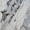 Répétition des mots sur une toile découpée en ruban en référence aux rubans tissés rebrodés. Ce ruban-ci fait avec amour et délicatesse à la hauteur de l’enjeu, la mise en scène accentuant la poésie du geste.