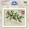 La carte "feuilles de houx" est rahaussé de paillettes rouges et le texte brodé au fil or a été crée par Monique Bonnin, ainsi que la carte "Meilleurs Voeux" aux motifs rouges traditionnels, duo complété par la carte "Bonne Année" à la branche de gui et au texte fleuri au point de croix.