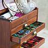 Les échevettes de Mouliné se rangent par ordre numérique dans les 5 tiroirs, faciles à classer et à retrouver, le haut se soulève révélant des compartiments permettant de recevoir les accessoires indispensables aux brodeuses.