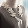 Quel bonheur de voir cette dentelle si finement réalisée remise au goût du jour par des motifs de feuilles et de fleurs imaginés par Sumi Fujishige, reprendre ses lettres de noblesse pour s’épanouir avec volupté dans un col à poser, en collier, en couronne ou en bijou d’oreille.