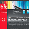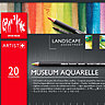 Les crayons MUSEUM AQUARELLE sont disponibles en assortiment standard; pour l'initiation, une boîte de 12 crayons sélectionnés selon une palette des teintes basée sur le système « double-primaire » d’Adolf Hölzel, une boîte Marine qui contient une sélection de 20 couleurs essentielles de tons chauds et froids, idéales pour traiter les thèmes des paysages maritimes, et Landscape qui présente un assortiment de 20 couleurs permettant de traiter les différents aspects de la représentation du paysage.
