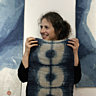 Le bleu indigo de Betty de Paris s’étend sur des supports comme la gaze de chanvre ou de ramie surfine. Betty de Paris aime à construire un univers en laissant la place au rêve.