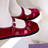 Les sandales chinoises en velours parme deviendront chaussons de bal décorés de petites pastilles torsadées enroulées, collées puis fixées par quelques points sur le devant du chausson.
