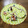 Des jouets vite rangés dans ce tapis de jeu très malin, réversible il se transforme vite fait d’un tour de fil élastique en un sac de rangement bien joli à accrocher à portée de main.