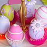 Les œufs en plastique sont faciles à peindre, la peinture accroche bien sur la surface en plastique, on peut aussi dessiner dessus avec des feutres ou des cern relief, les décorer avec des pastilles adhésives, coller des paillettes ou des yeux qui leur donneront un air rigolo.
