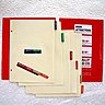 Pour recouvrir les couvertures, encollez une face de chaque cartonnette avec la colle vinylique passée à la brosse plate. Collez le papier rouge bien centré sur cette face, lissez pour chasser les bulles d'air et retournez. Découpez en biais chaque angle avec les ciseaux en laissant 1 mm de papier au-dessus de la pointe. Marquez le papier rouge avec le plioir en suivant le contour de la cartonnette, repliez les 4 côtés sur l'intérieur.