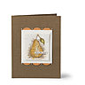 La poire, fruit d’automne est imprimé sur un texte à l’ancienne, coloré avec des encres sur un joli papier, superposition de 3 cartes pour rendre un effet 3D et montage sur une carte brune agrémentée d’un feston de papier orange et de fines perles nacrées.