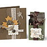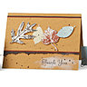 Une boîte pour offrir un petit cadeau à fabriquer et une carte de remerciement réalisée par une superposition de matériaux divers, carte festonnée, bouton, faisan et feuilles, dentelle et cartes à rayures sont un subtil assemblage.