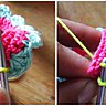 Changez de couleur et prenez une couleur contrastée, piquez le crochet entre les rangs de maille serrée rose, piquez le crochet à l’intérieur du premier trou, ressortez-le dans le trou suivant, récupérez la laine faites une maille coulée, vous obtenez une boucle, renouvelez jusqu’au bout du rang pour obtenir une chaînette. Coupez le fil et le passez à l’arrière du travail.
